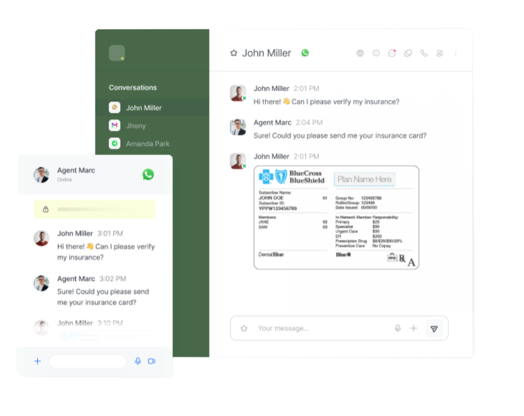 Sistema de tickets, historial de chat completo y permisos basados en roles. Proporciona servicio 24/7 a tus pacientes desde cualquier lugar: dispositivo móvil, escritorio o navegador web.